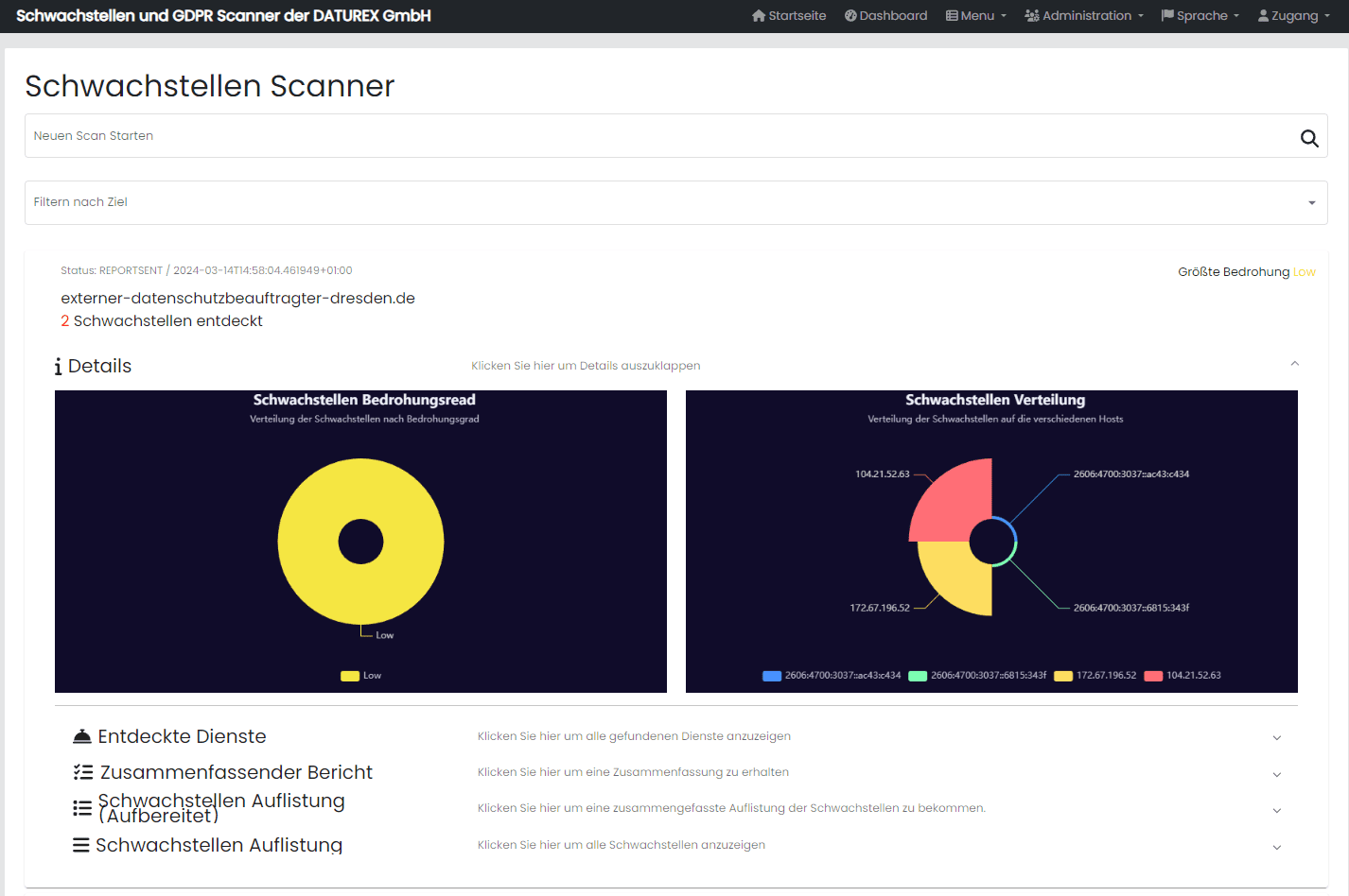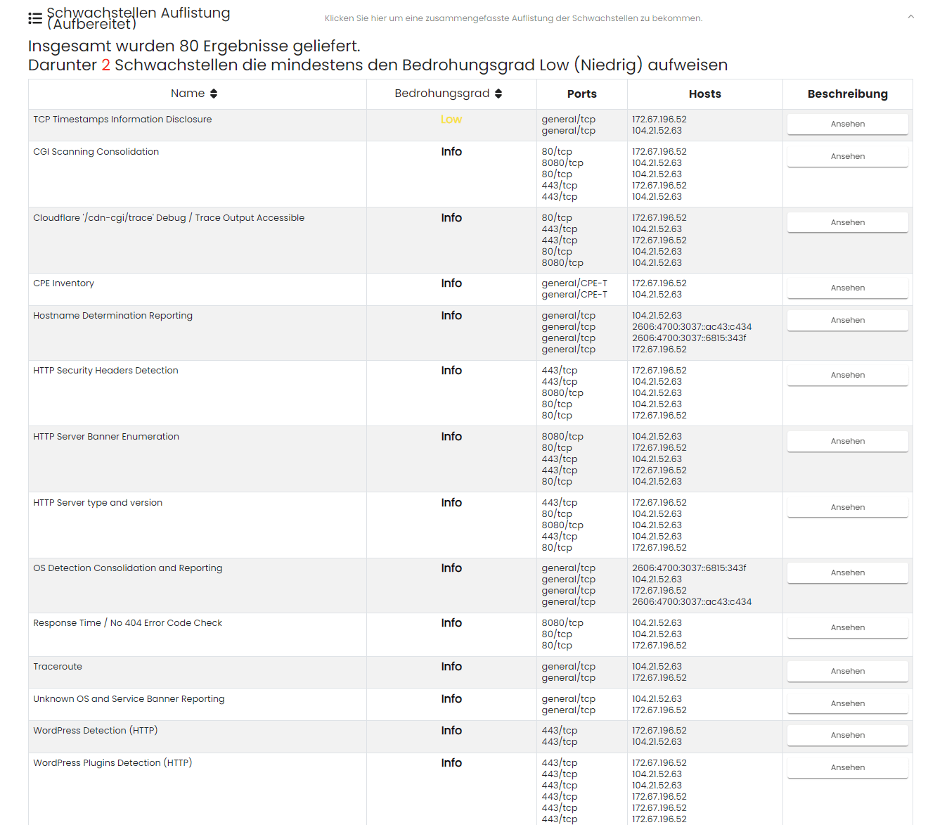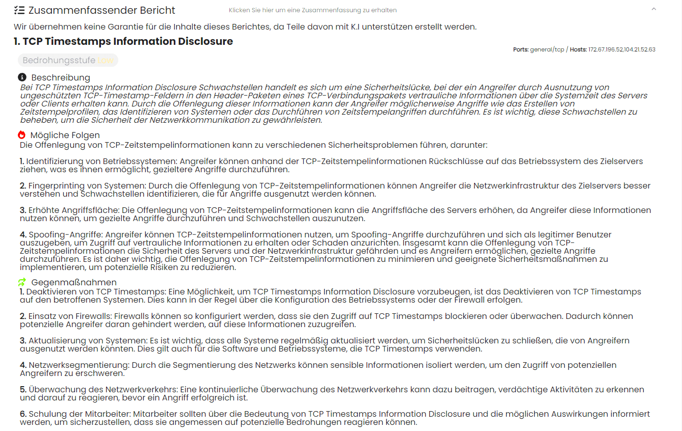 Zidentyfikowane podatności są podzielone na kategorie według poziomu zagrożenia i przedstawione w zrozumiałym języku angielskim. Odpowiednie podsumowanie jest jednak napisane w języku niemieckim. Przyszłe wersje naszej usługi będą oferować możliwość generowania automatycznych tłumaczeń na różne języki.