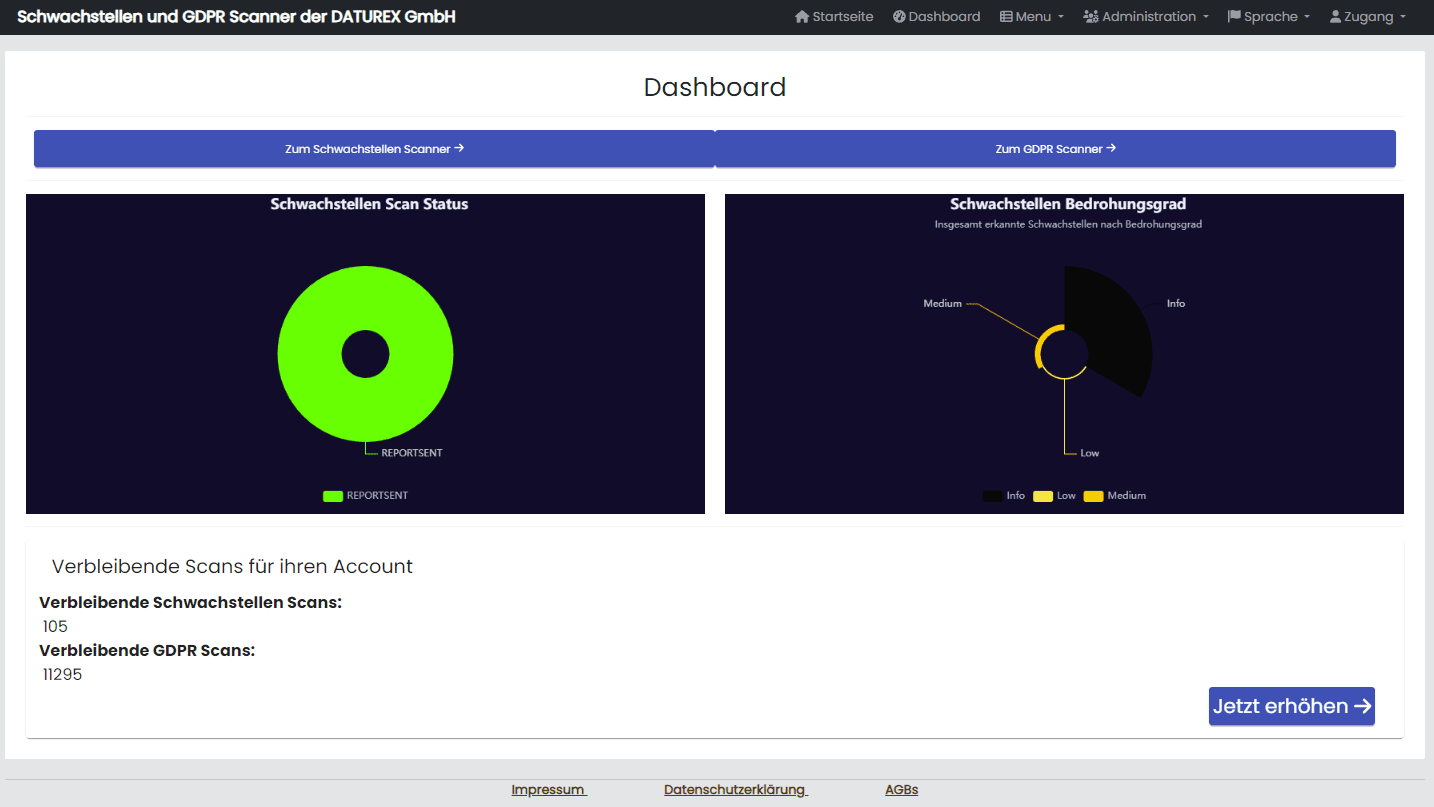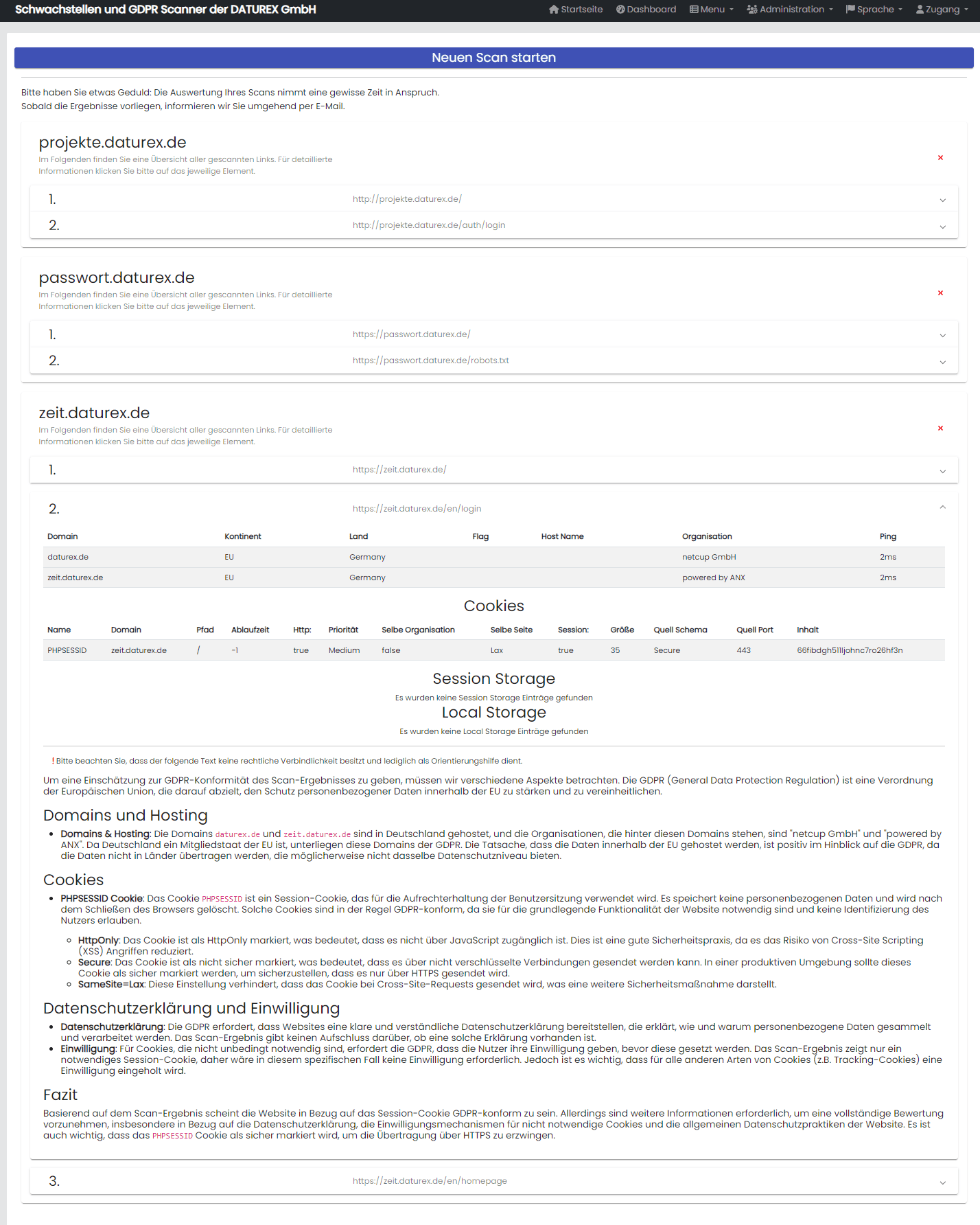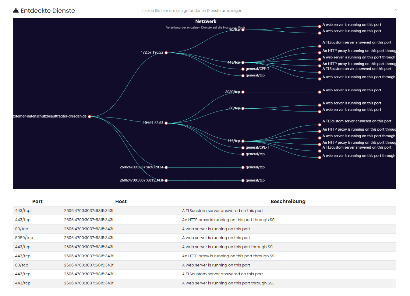 Zidentyfikowane podatności są podzielone na kategorie według poziomu zagrożenia i przedstawione w zrozumiałym języku angielskim. Odpowiednie podsumowanie jest jednak napisane w języku niemieckim. Przyszłe wersje naszej usługi będą oferować możliwość generowania automatycznych tłumaczeń na różne języki.